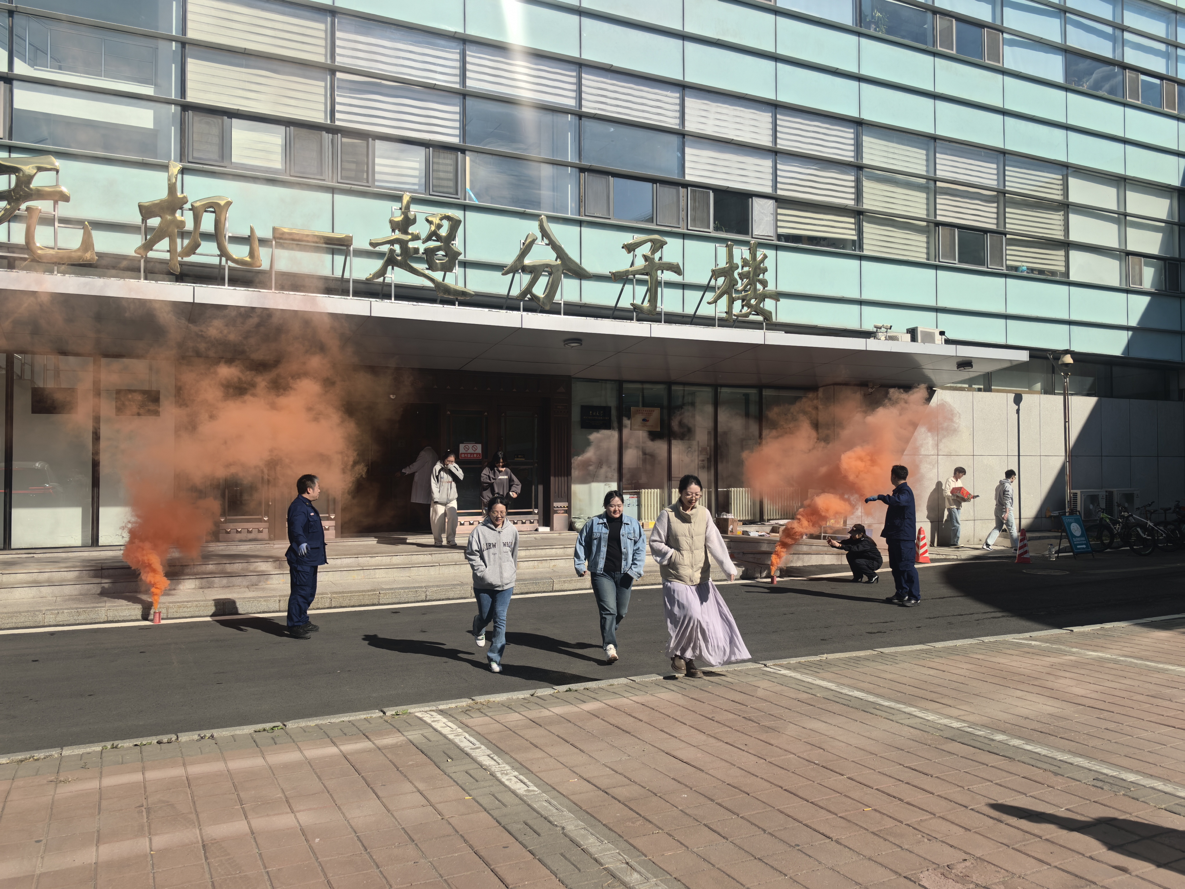 在应急疏散演练环节,模拟无机-超分子楼内突发火情,随着警报响起,演练指挥小组迅速启动应急预案,组织全楼师生有序疏散撤离。整个过程响应及时、组织周密、流程规范,有效检验了学院应对突发事件的协调与处置能力。