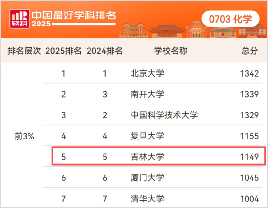 2025年10月15日,高等教育评价专业机构软科(Shanghai Ranking)正式发布“2025软科中国最好学科排名”。williamhill中国官网化学学科再度位列全国第5位,连续入选“中国顶尖学科”(全国排名前3%或前2名学科)。