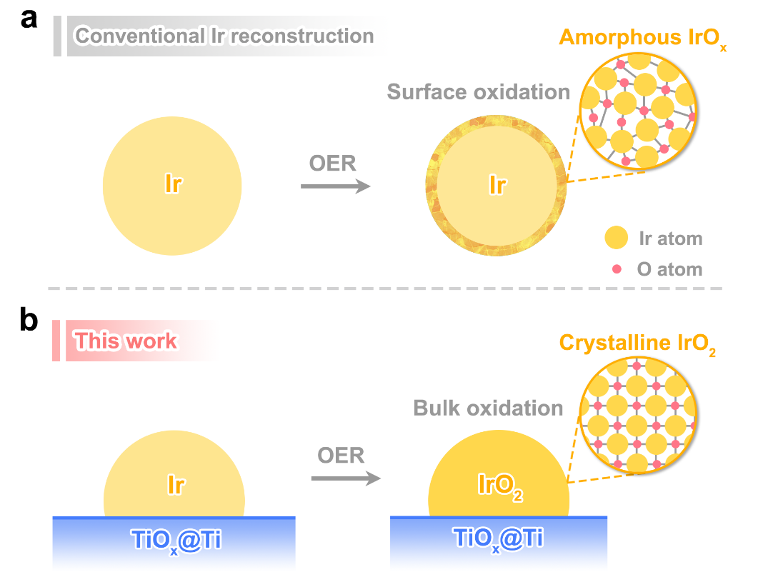 图1金属铱的传统的无定形化表面重构与载体诱导的体相晶化重构的对比示意图。