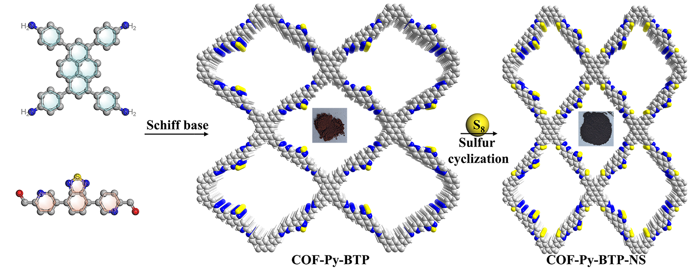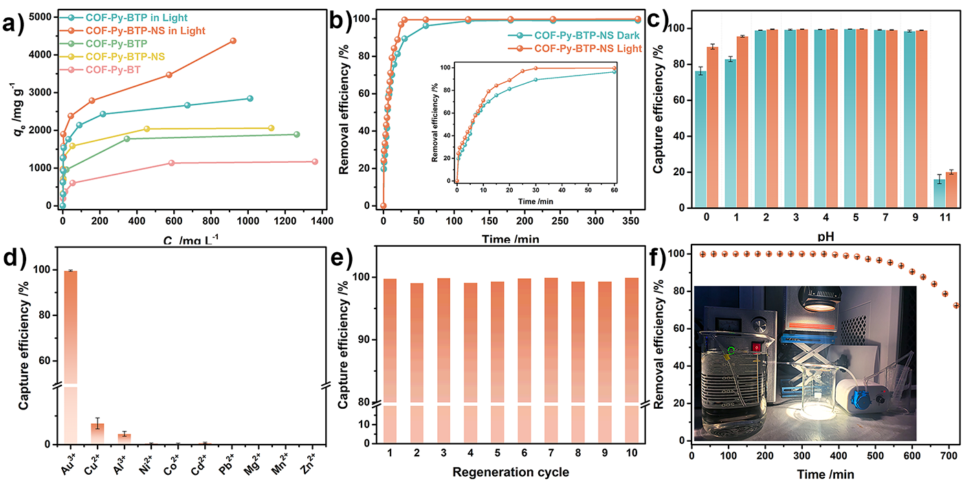 针对上述问题,williamhill中国官网梁志强教授和宋晓伟教授课题组联合香港城市大学孙立波研究员,将吡啶单元引入5,5'-(苯并[c][1,2,5]噻二唑-4,7-二基)二吡啶醛的受体片段,并与芘基电子供体单元结合,构建出D−A型COF-Py-BTP。COF-Py-BTP中的吡啶单元通过与亚胺氮原子形成配位位点捕获金离子。此外,进一步通过将可逆亚胺连接的COF-Py-BTP转化为不可逆噻唑连接的COF-Py-BTP-NS,获得了一种高度共轭且超稳定的光辅助金捕获材料。与COF-Py-BTP相比,COF-Py-BTP-NS不仅具有更快的电子分离和转移能力,而且通过引入硫原子提高了金捕获效率。在光照条件下,COF-Py-BTP-NS的Au(III)捕获容量显著提升至4374 mg g–1,优于众多的金吸附材料,同时对于众多的干扰离子具有优异的吸附选择性,并在多次循环中保持稳定。DFT计算证明了噻唑链接的COF-Py-BTP-NS具有更低的金吸附能量。COF-Py-BTP-NS对于实际电子废弃物同样具有优异的金回收效率,填充柱实验证明了其在光照下对于电子废弃物中的金提取具有长时的高选择性与回收率。