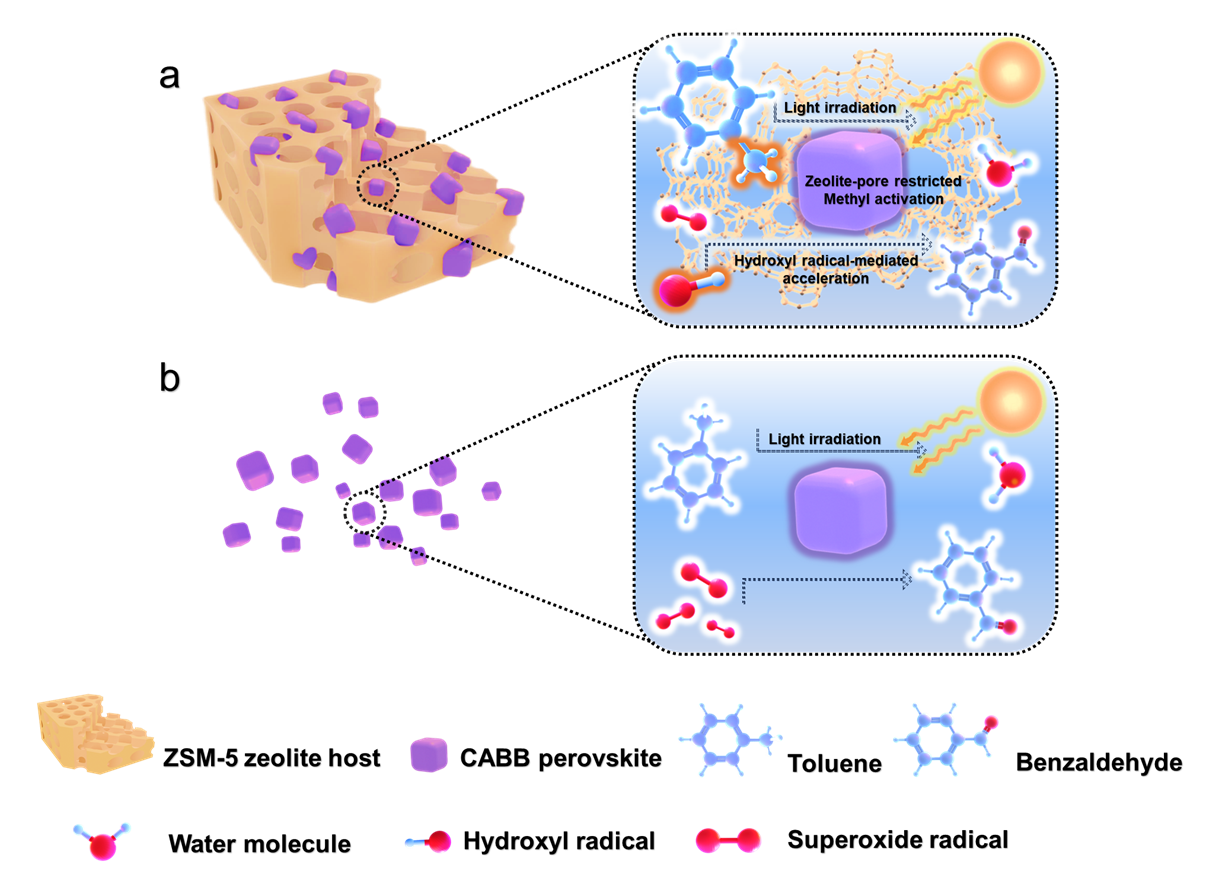 针对上述问题,本研究创新性地将分子筛作为光活性载体用于负载钙钛矿纳米晶,成功触发羟基自由基(•OH)介导的选择性C(sp³)–H键活化反应路径。通过主–客体组装策略将Cs2AgBiBr6(CABB)纳米晶限域封装于ZSM-5分子筛基质中,实现了甲苯高效选择性氧化为苯甲醛。值得注意的是,机理研究表明,非光活性的分子筛主体在可见光照射下可通过生成羟基自由基(•OH)促进甲苯氧化,这是反应的关键步骤。所制备的CABB@ZSM-5催化剂在常温常压、可见光照射下,可将甲苯高效转化为苯甲醛,选择性超过98%,生成速率高达40.9 mmol·g-1·h-1,约为Bulk-CABB(1.0 mmol·g-1·h-1)的41倍,代表了近期光催化领域报道的最高性能。综合光谱分析表明,客体CABB与ZSM-5主体之间的相互作用显著增强了复合材料对氧气和甲苯分子的吸附与活化能力。研究还发现,分子筛孔道中吸附的水分子有助于推动•OH介导的反应路径,该路径相较于传统的超氧自由基(•O2⁻)路径更具热力学优势。此外,在CABB@ZSM-5中引入Zn2+能够进一步提升苯甲醛的生成效率。这些发现不仅揭示了通常被视为非光活性载体的分子筛在光催化过程中的关键作用,也凸显了分子筛基主–客体光催化剂设计的广阔潜力,为发展可持续化学转化技术提供了创新思路。