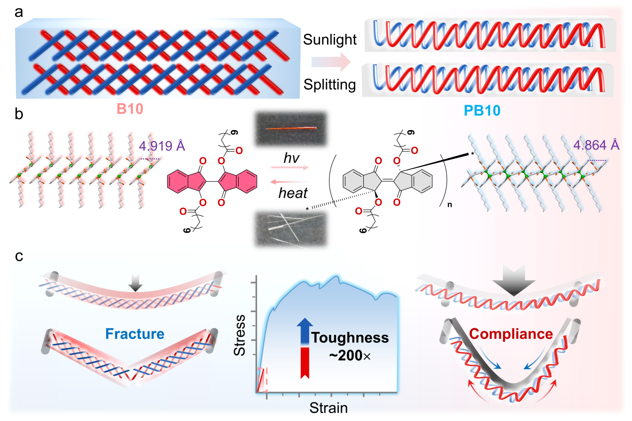 研究团队精心设计并合成了一种具有独特光响应特性的有机分子晶体B10。在温和可见光(2.5 W cm⁻²)照射下,这种厘米级针状晶体展现出动态行为:首先发生可控的卷曲和“裂变”过程,随后逐渐伸直,同时伴随着颜色从红色到无色的显著变化。这一宏观现象的背后,是一场深刻的分子级重构——晶体中原本依赖较弱π···π堆积作用的分子排列,被新形成的牢固C–C共价键网络所取代,实现了从单体晶体(B10)到聚合物晶体(PB10)的精准转变,同时保持了晶体的长程有序结构。通过单晶X射线衍射等表征手段,研究团队深入解析了这一独特的光聚合机制。研究发现,在光照条件下,B10分子中的反应位点发生电子密度重排,促使相邻分子间形成新的C–C键,构建出延展的聚合物链。这一过程伴随着晶格参数的精确调整——单元晶胞体积收缩约4%,分子骨架发生适度扭转(27.7°),这些微观变化在晶体内部产生可控的应变场,最终驱动了观察到的宏观形变。
