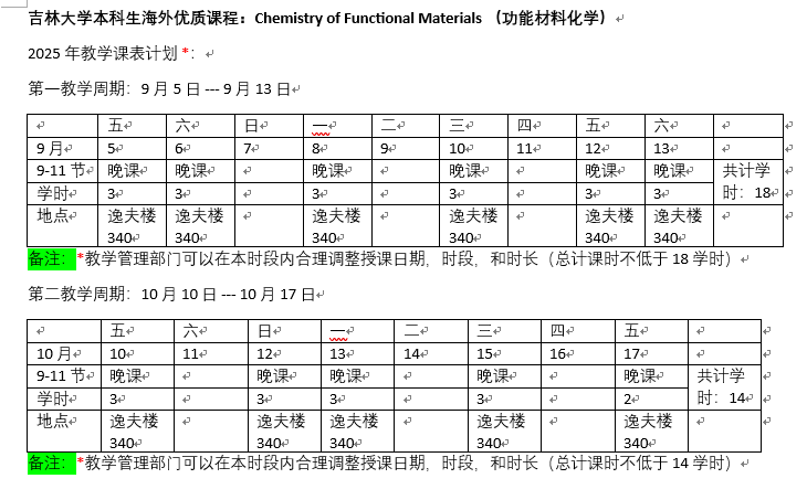 7)《功能材料化学》为本学期开设一门海外优质课程专业选修课,本课程邀请丹麦奥尔堡大学于冬宏教授全英文授课。课程大纲见QQ群文件,上课时间与地点见下列图片,是9月5日-9月13日和10月10日-10月17日之间的11次晚课(9到11节,18:20-20:45)。由于系统录入新课程需要时间,暂时不能记录到课程表中,请选课同学自行判断是否与现有课冲突。